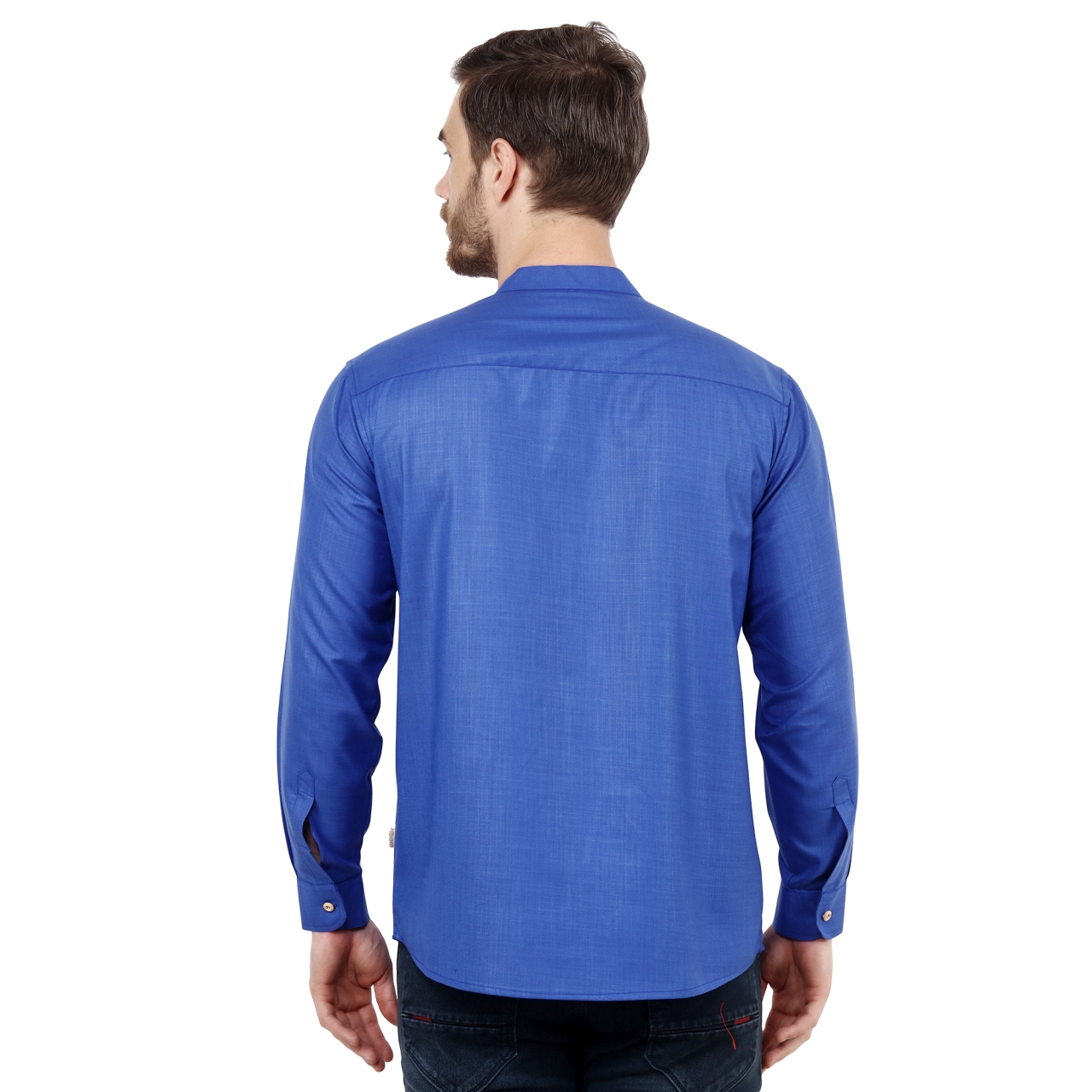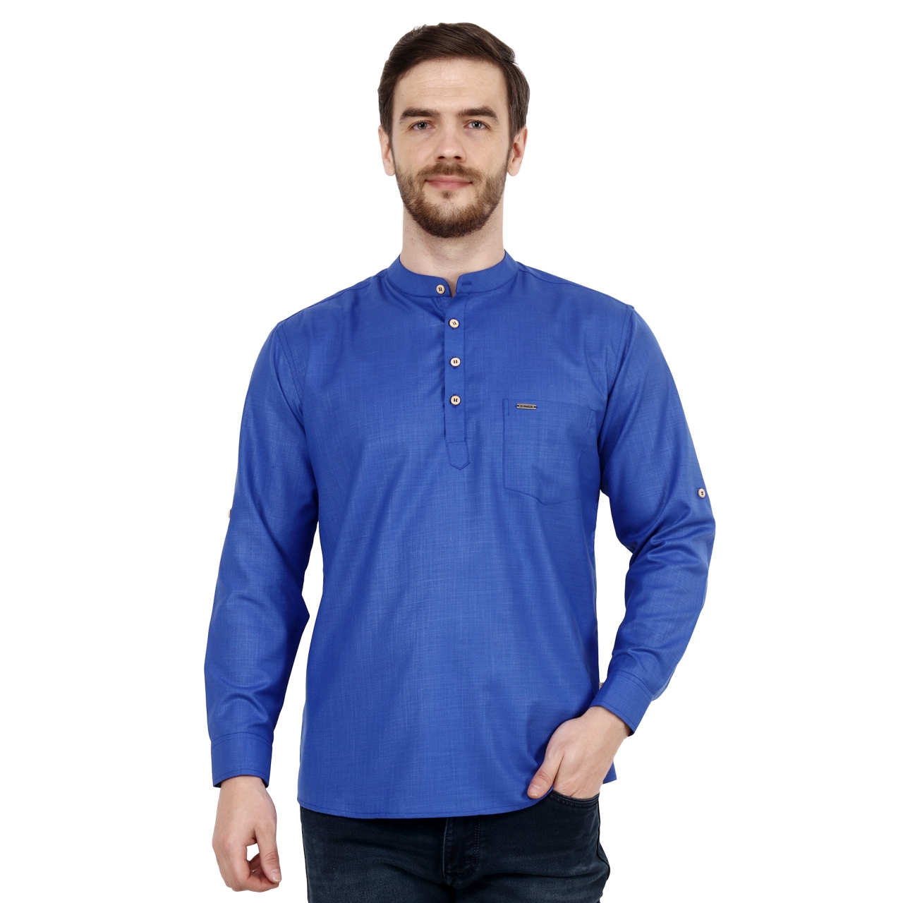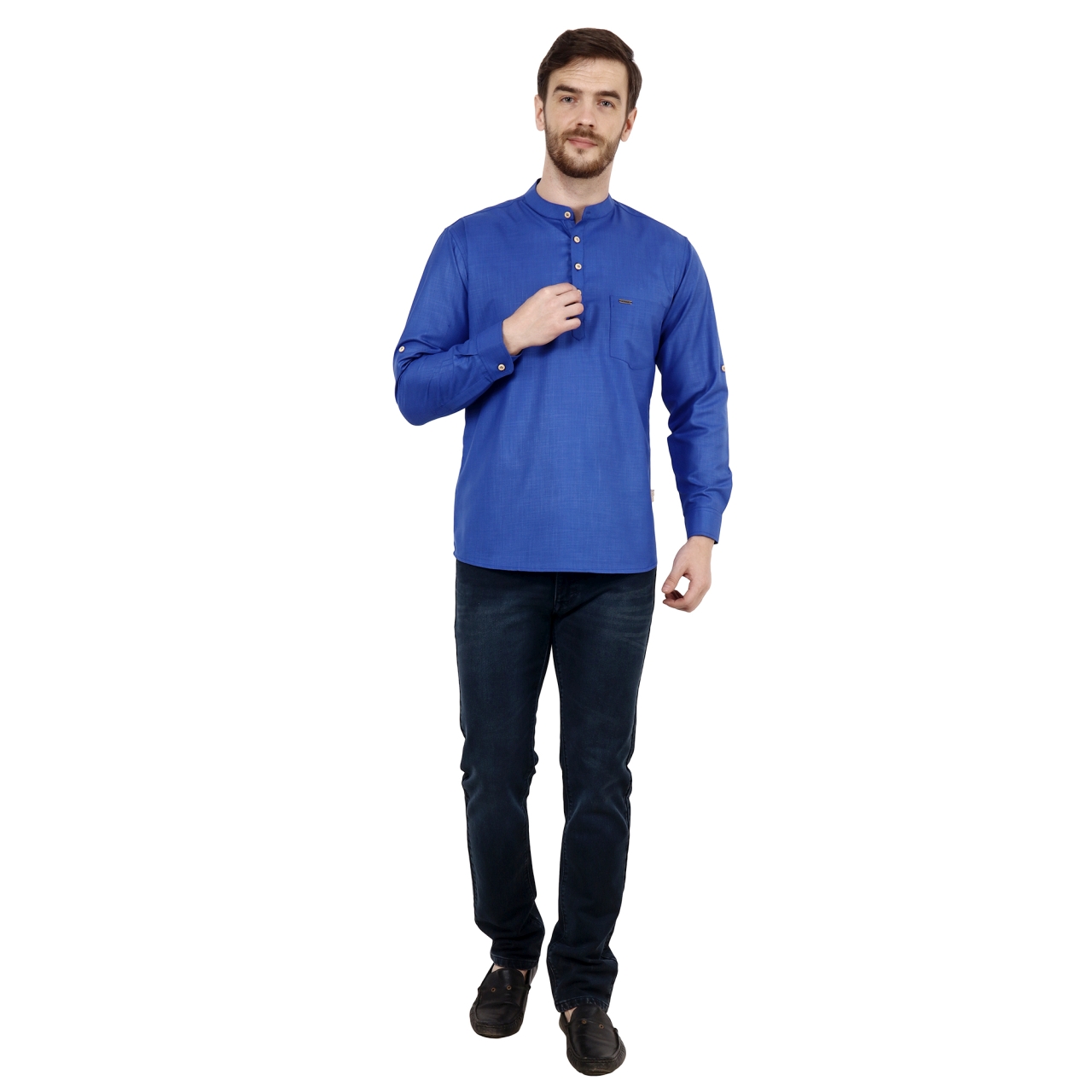 Ultramarine Blue solid straight short kurta has a man darin collar full sleeves with roll-up tab, Button closure and one patch pocket.