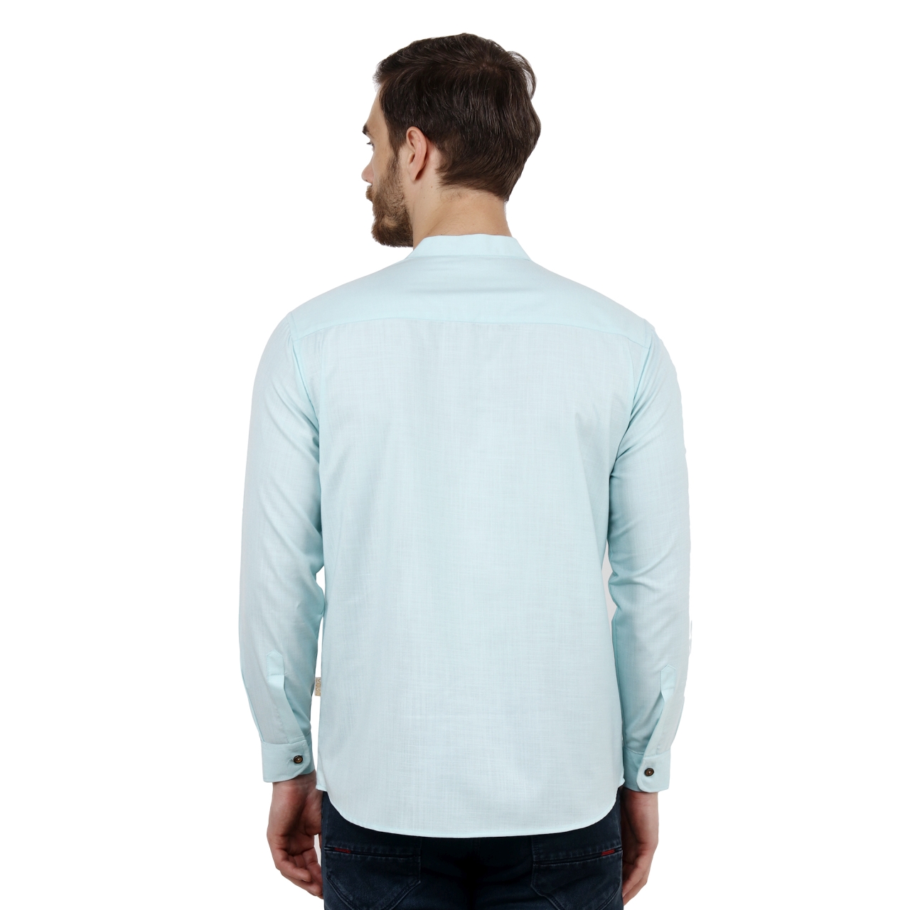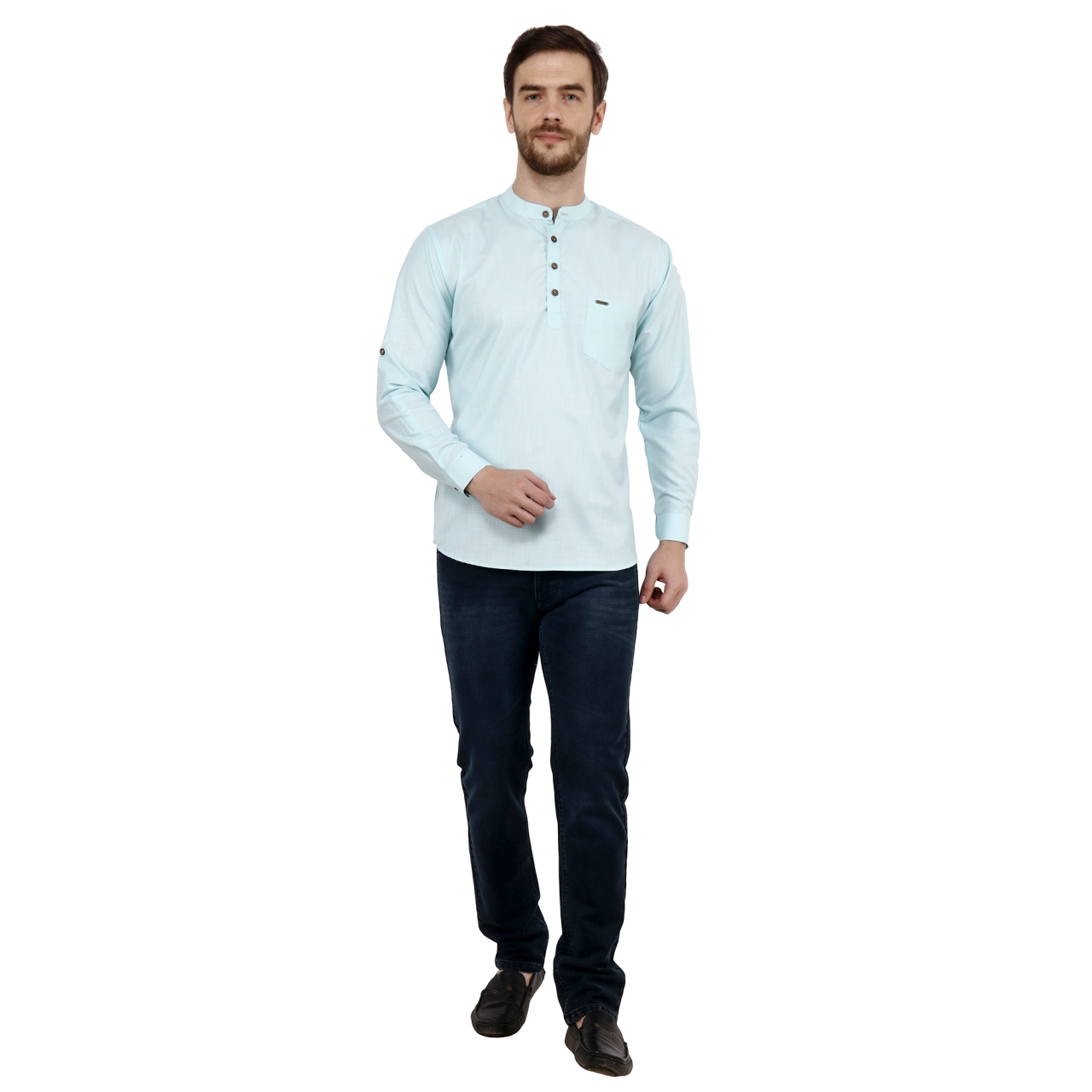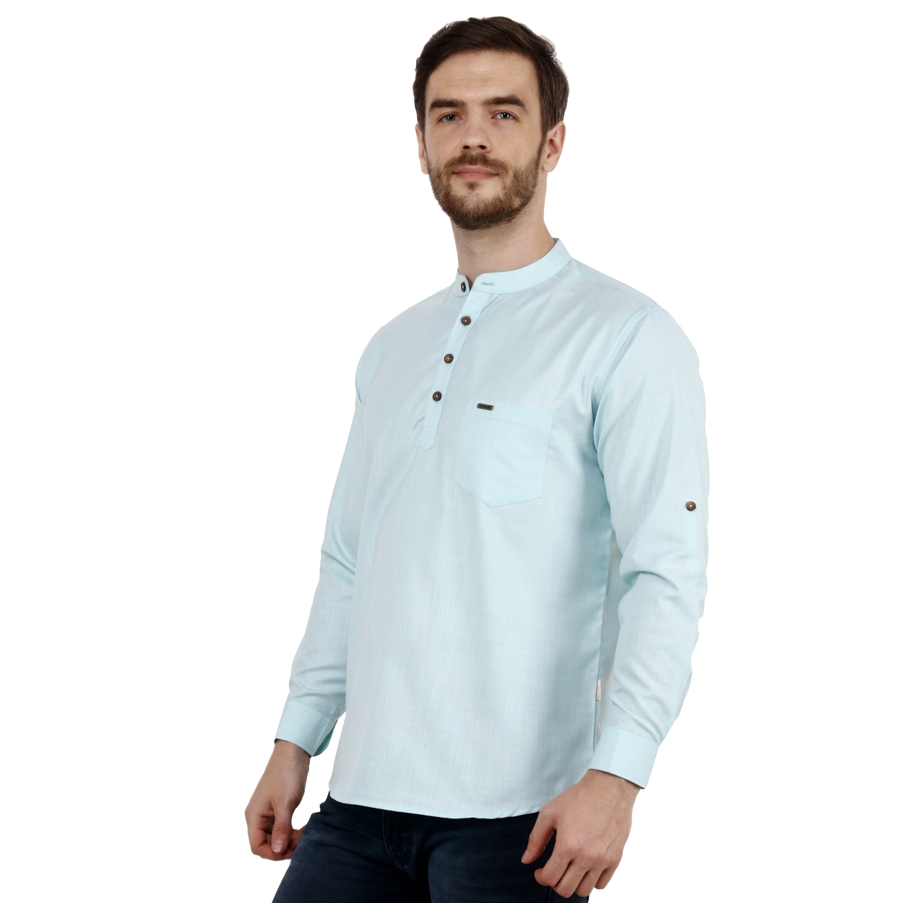 Light Turquoise Green solid straight short kurta has a man darin collar full sleeves with roll-up tab, Button closure and one patch pocket.