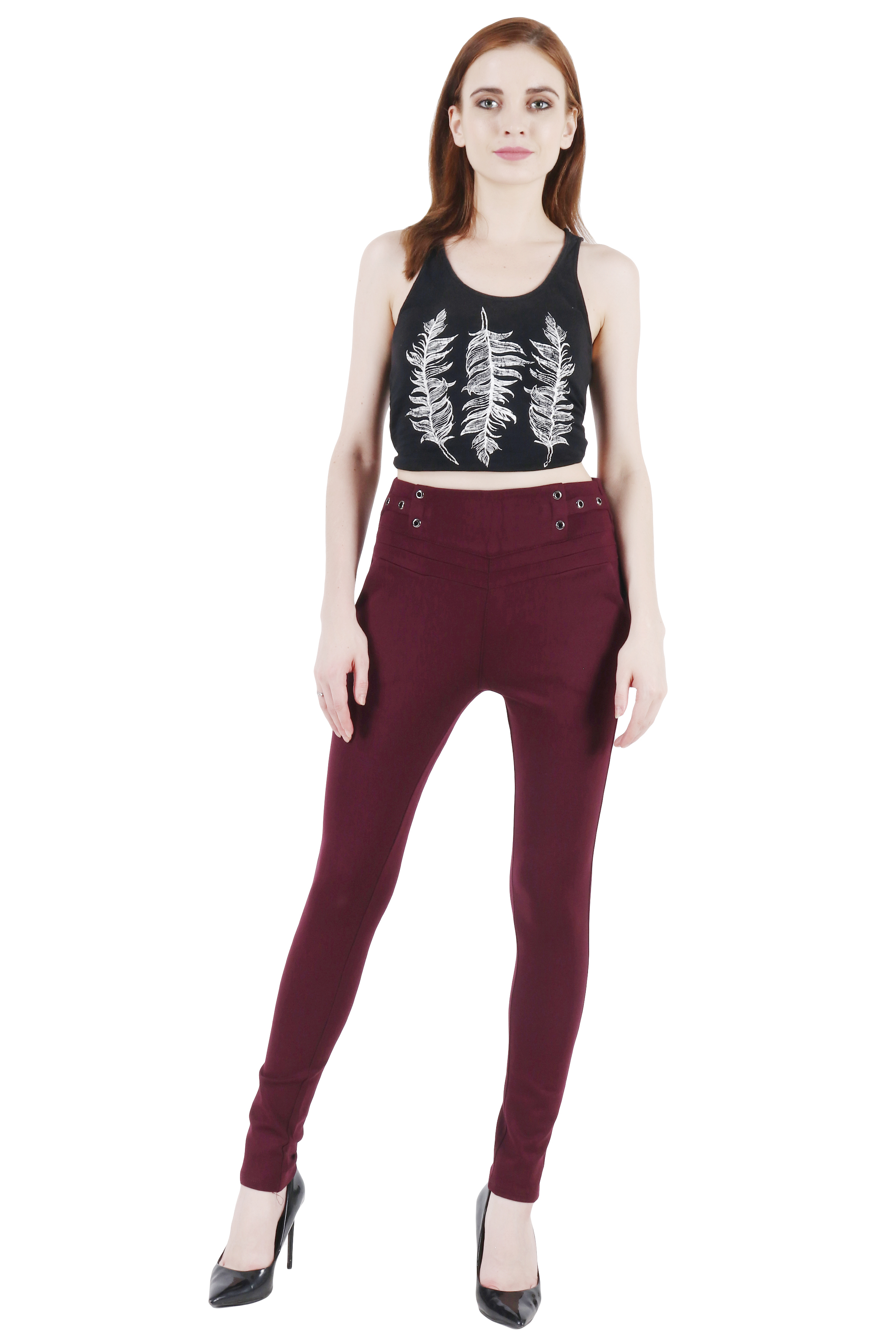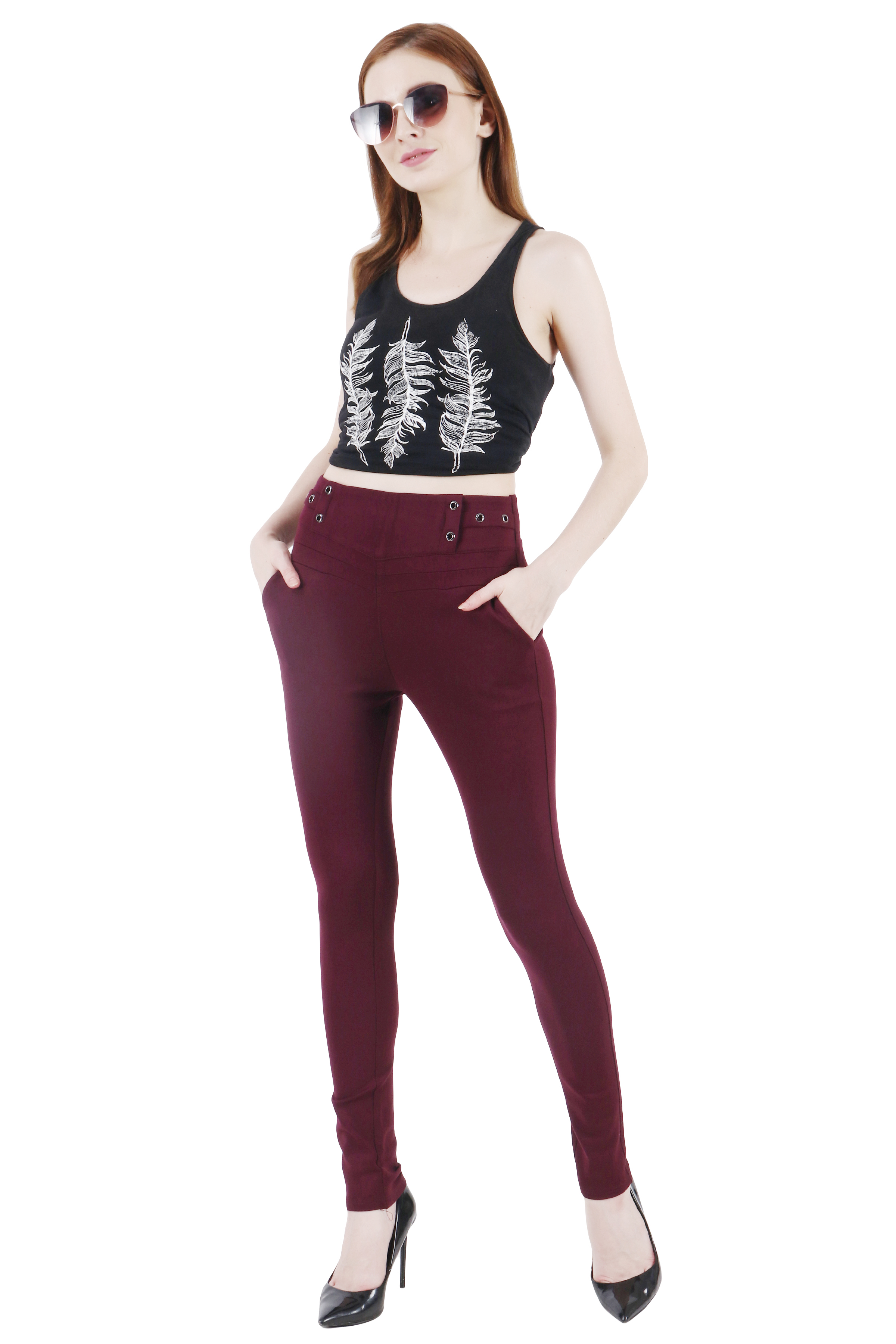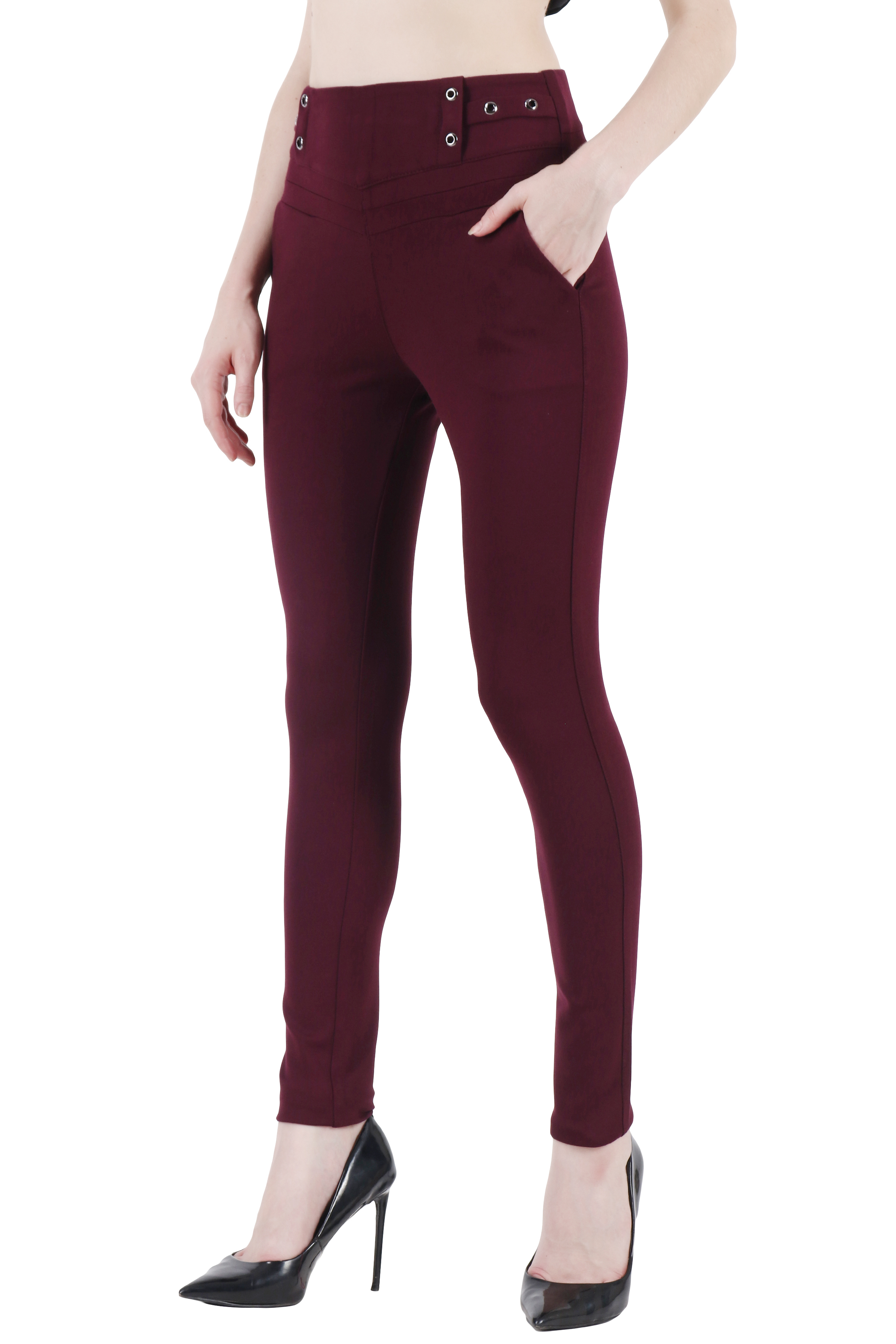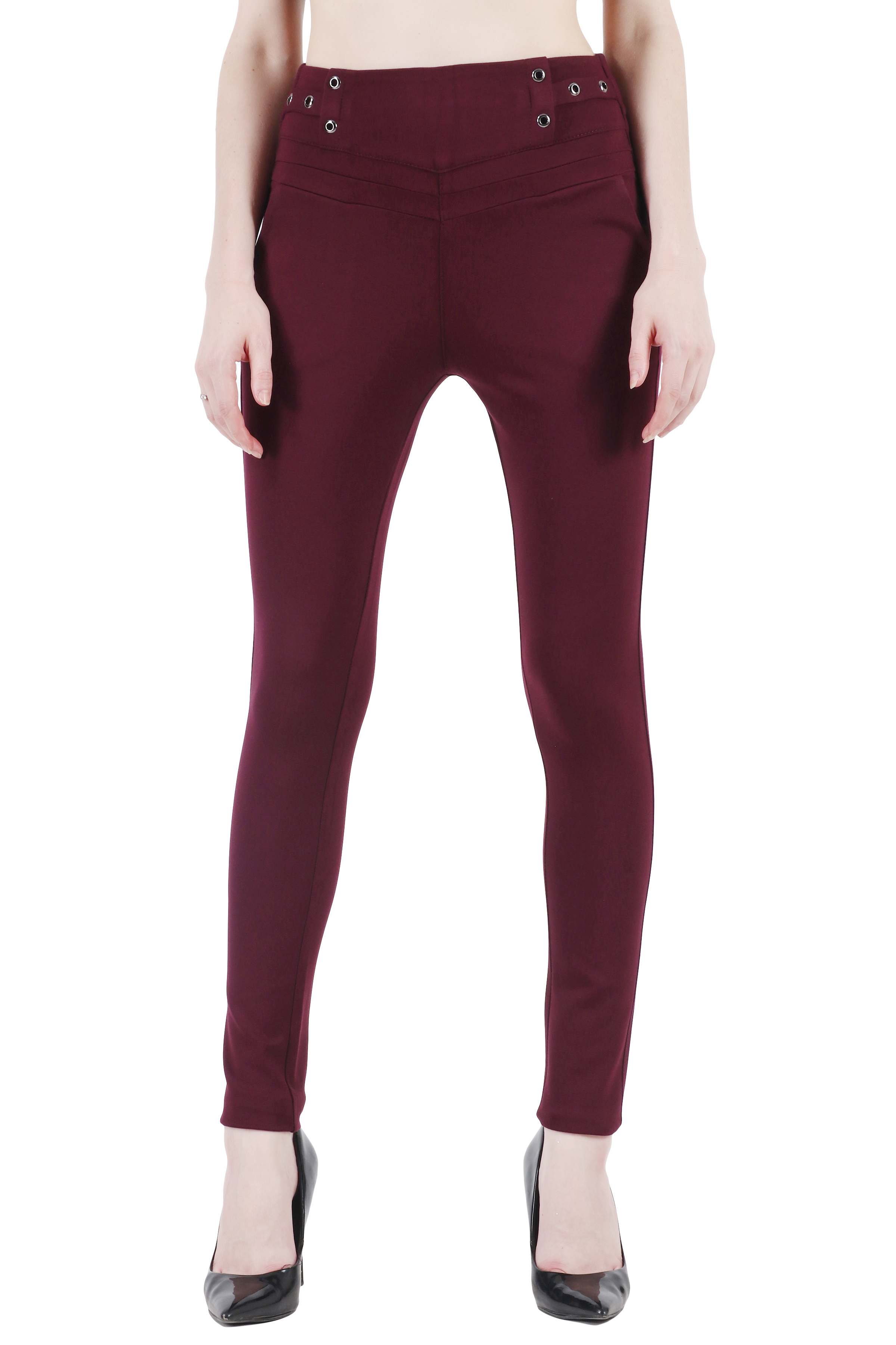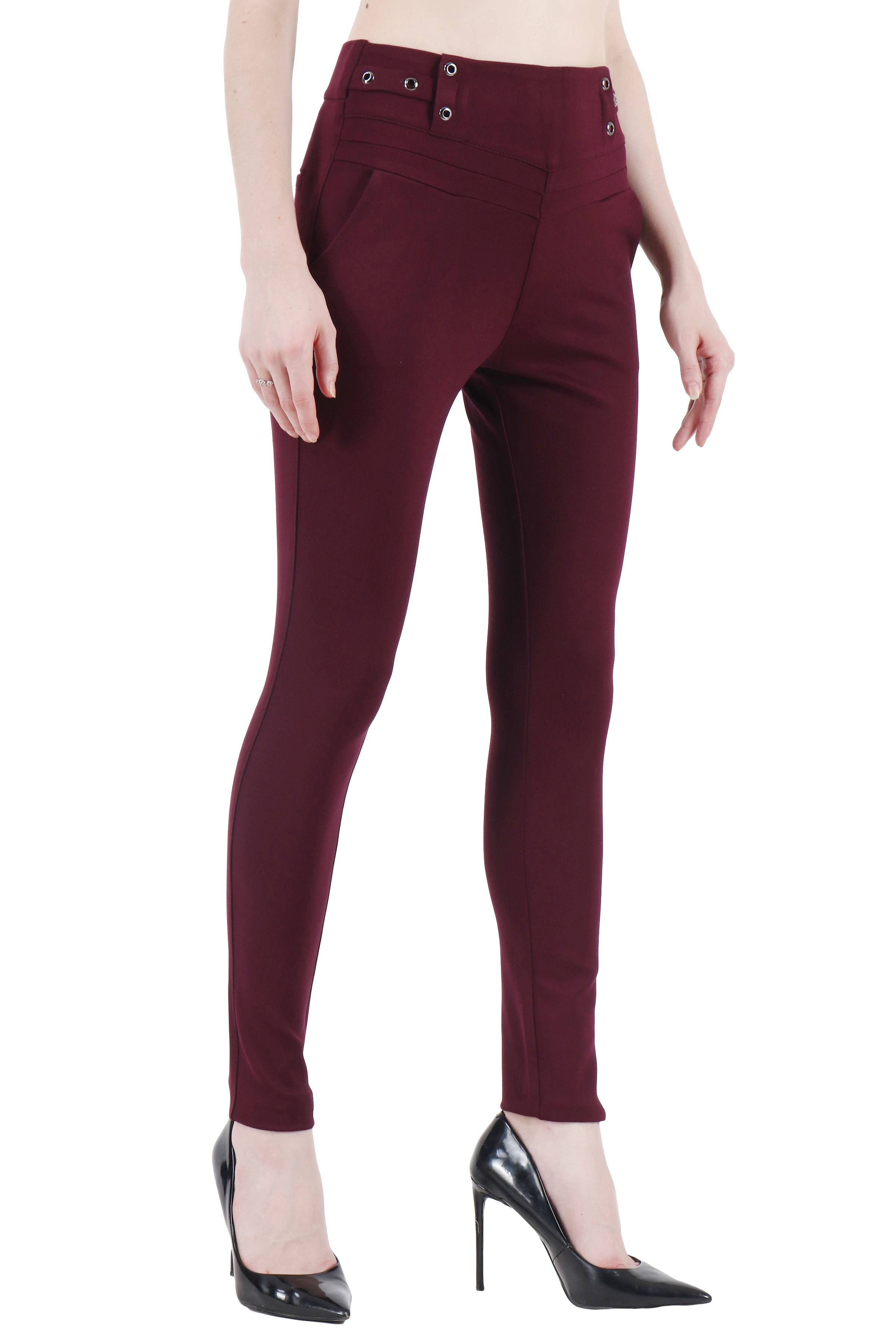 Wine Stylish and well-fitted designer Jegging, Breathable and Premium smooth fabric for all-day comfort, has an elasticated waistband for extra comfort and two front pockets, All styling accessories ( elastic, zipper, and buttons) used on the garment are of the best quality.