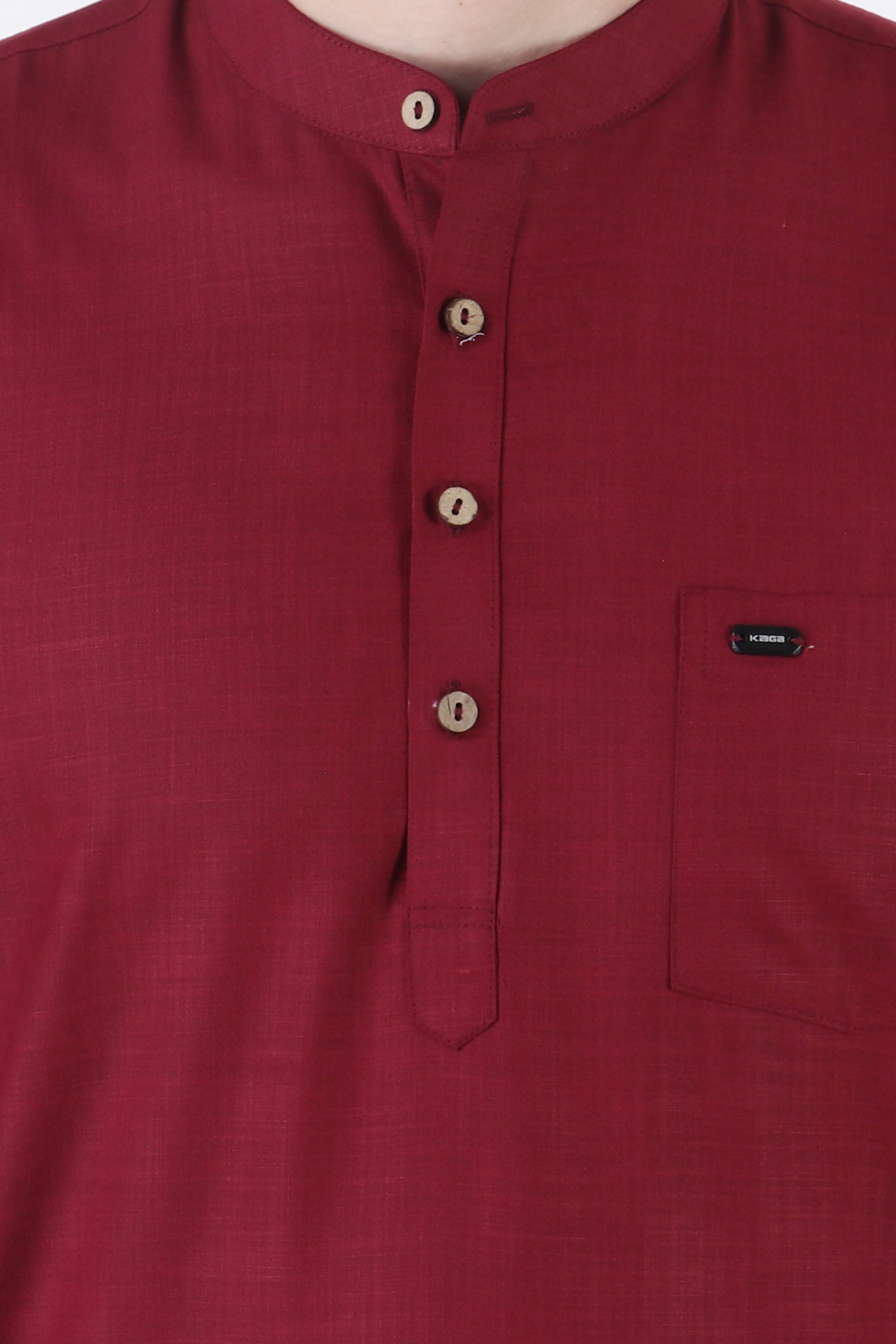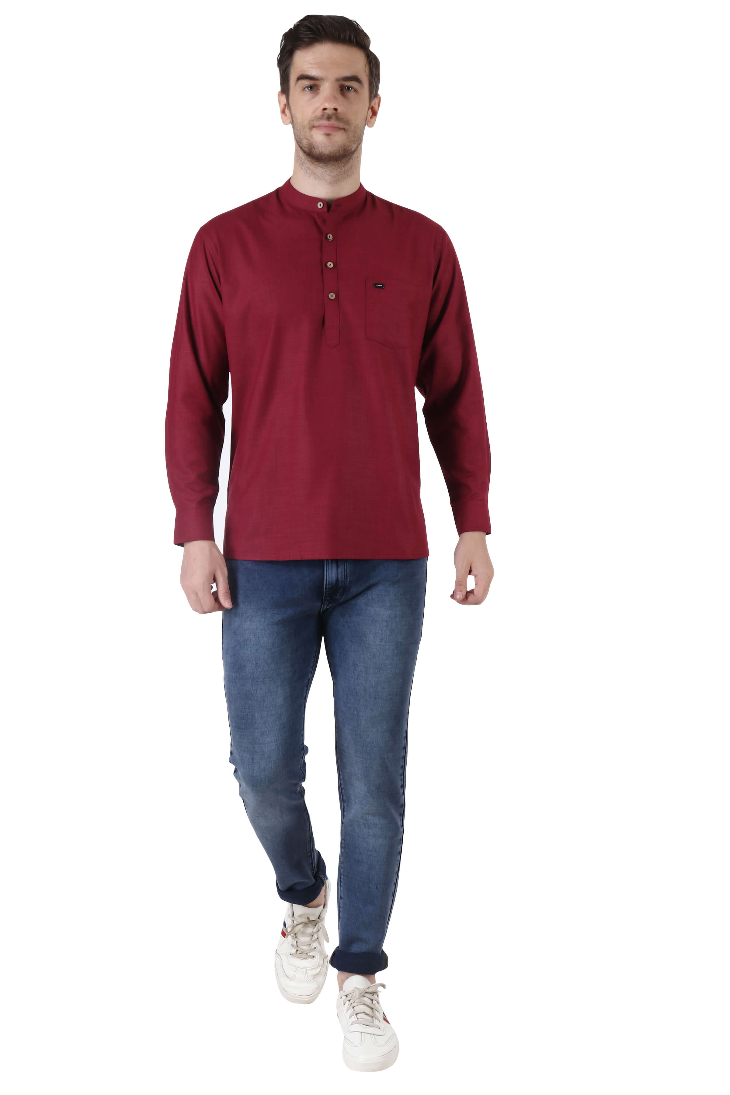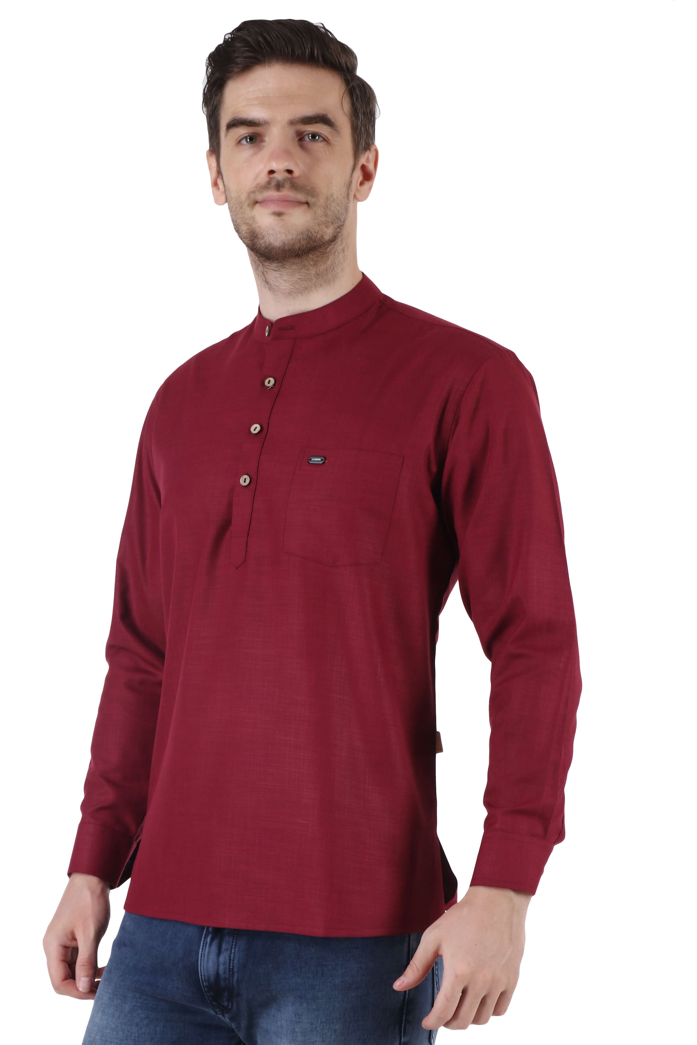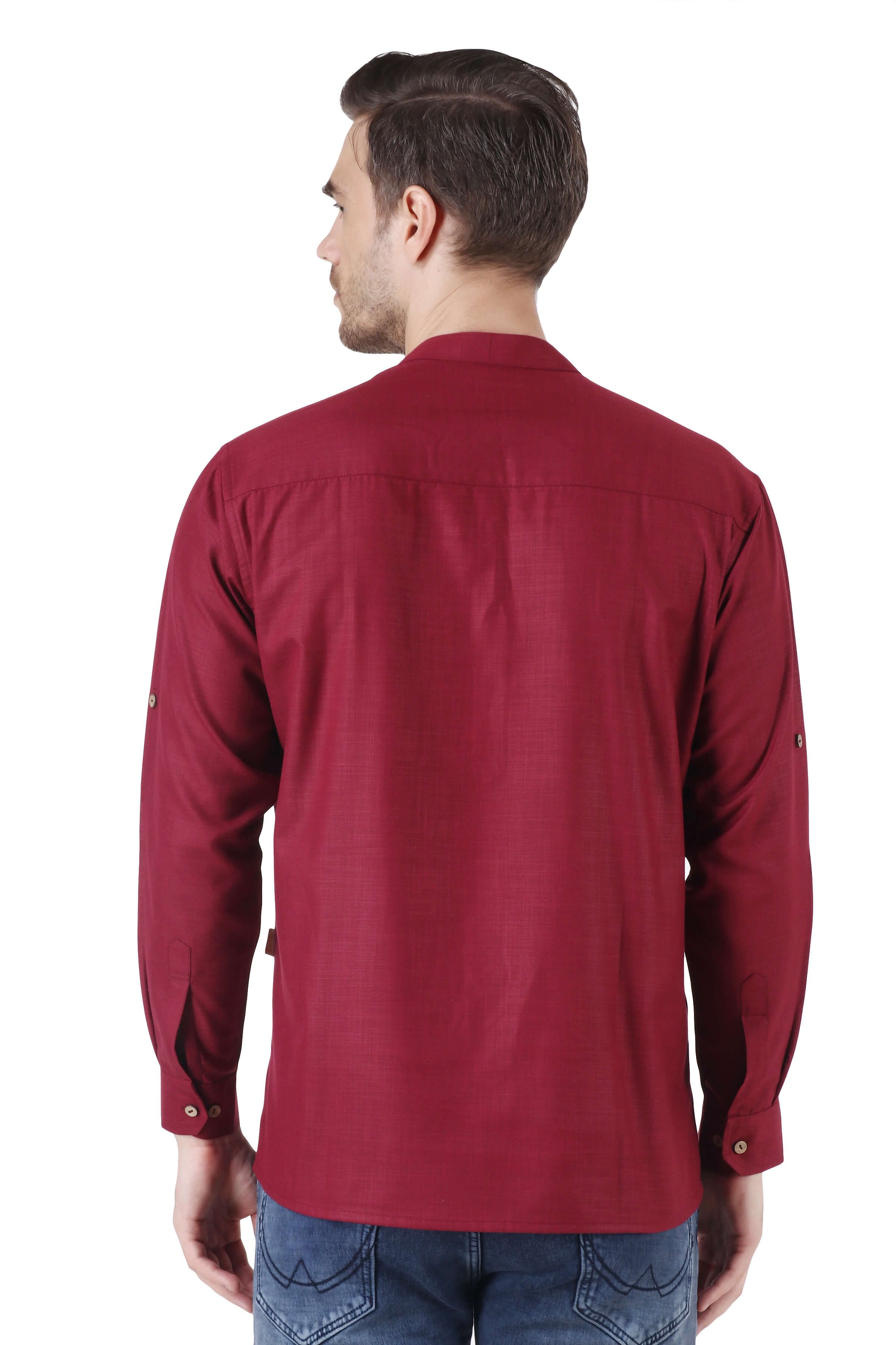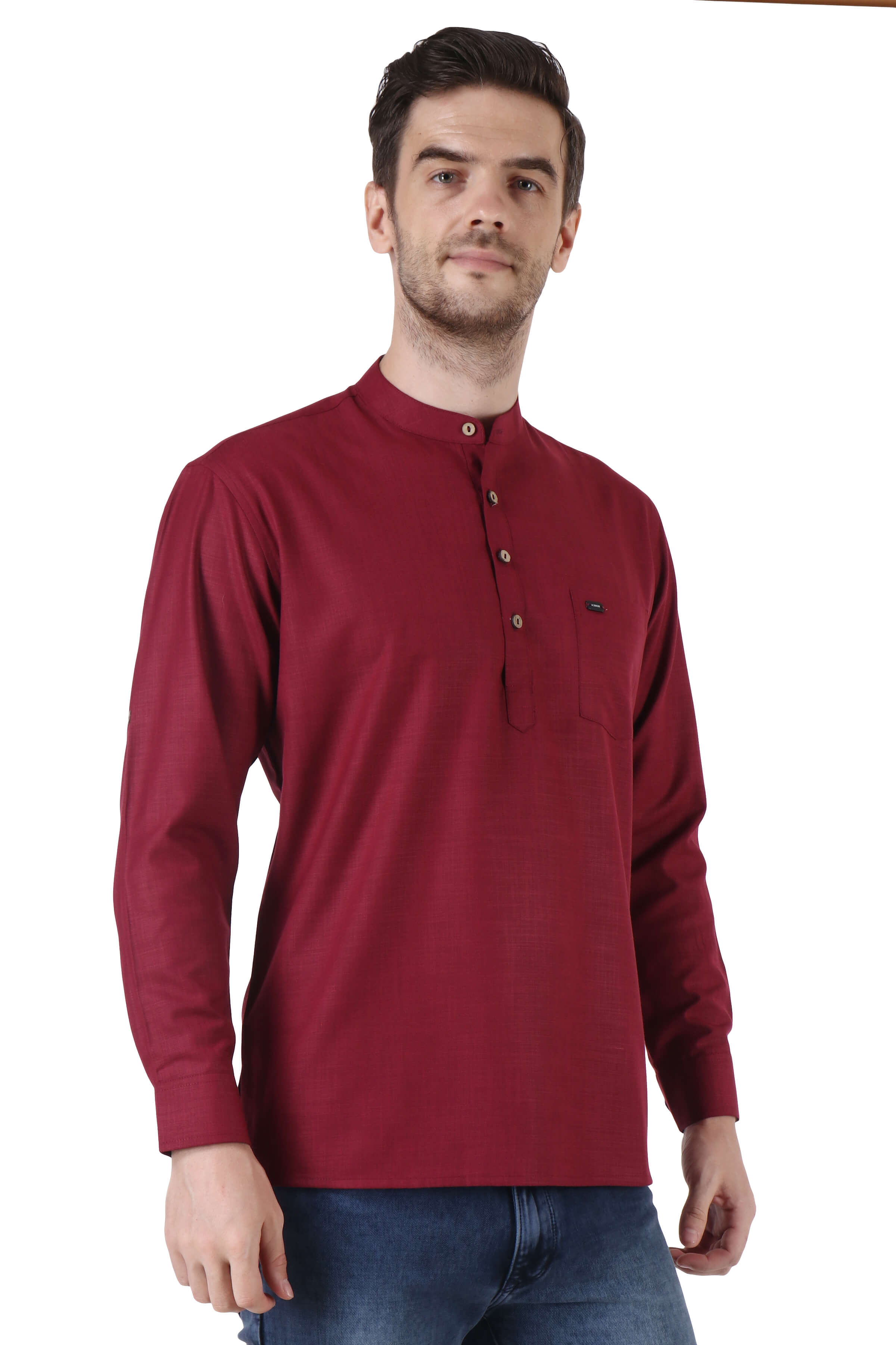 Wine Red solid straight short kurta has a man darin collar full sleeves with roll-up tab, Button closure and one patch pocket.
