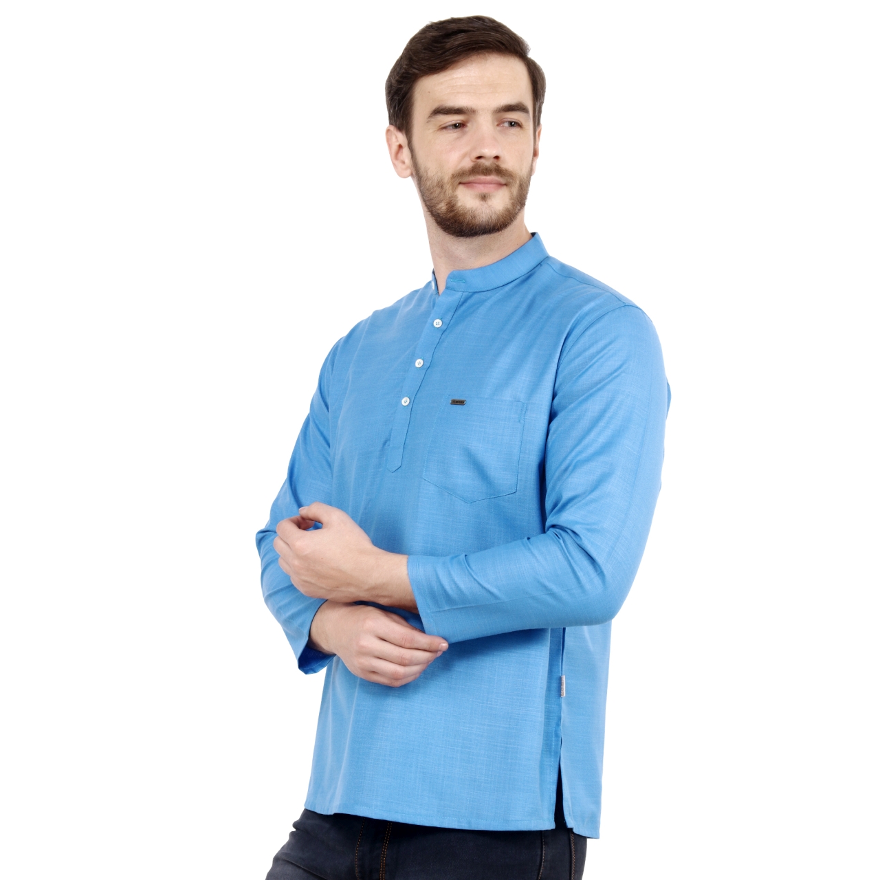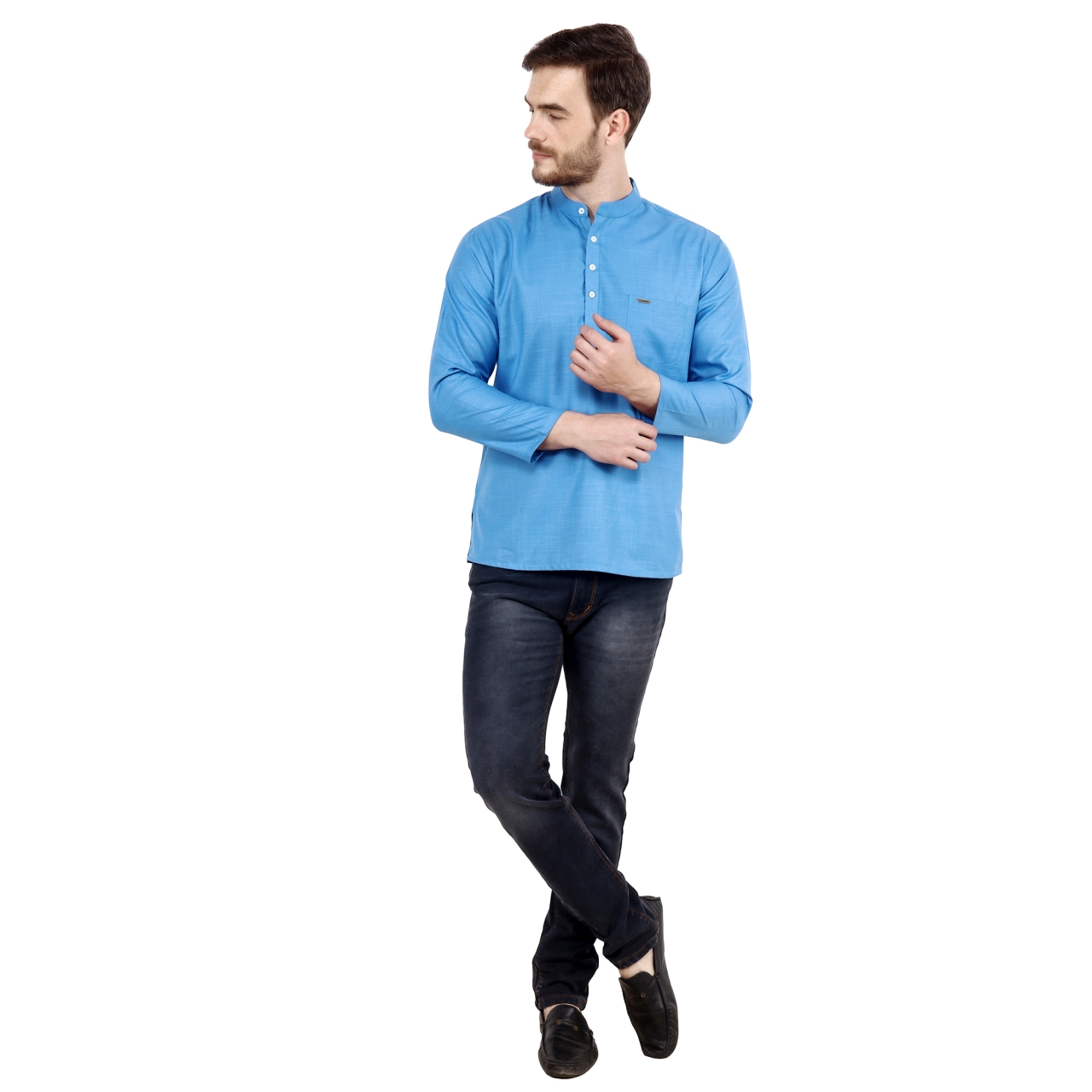Light Blue solid straight short kurta has a man darin collar short sleeves with roll-up tab, Button closure and one patch pocket.