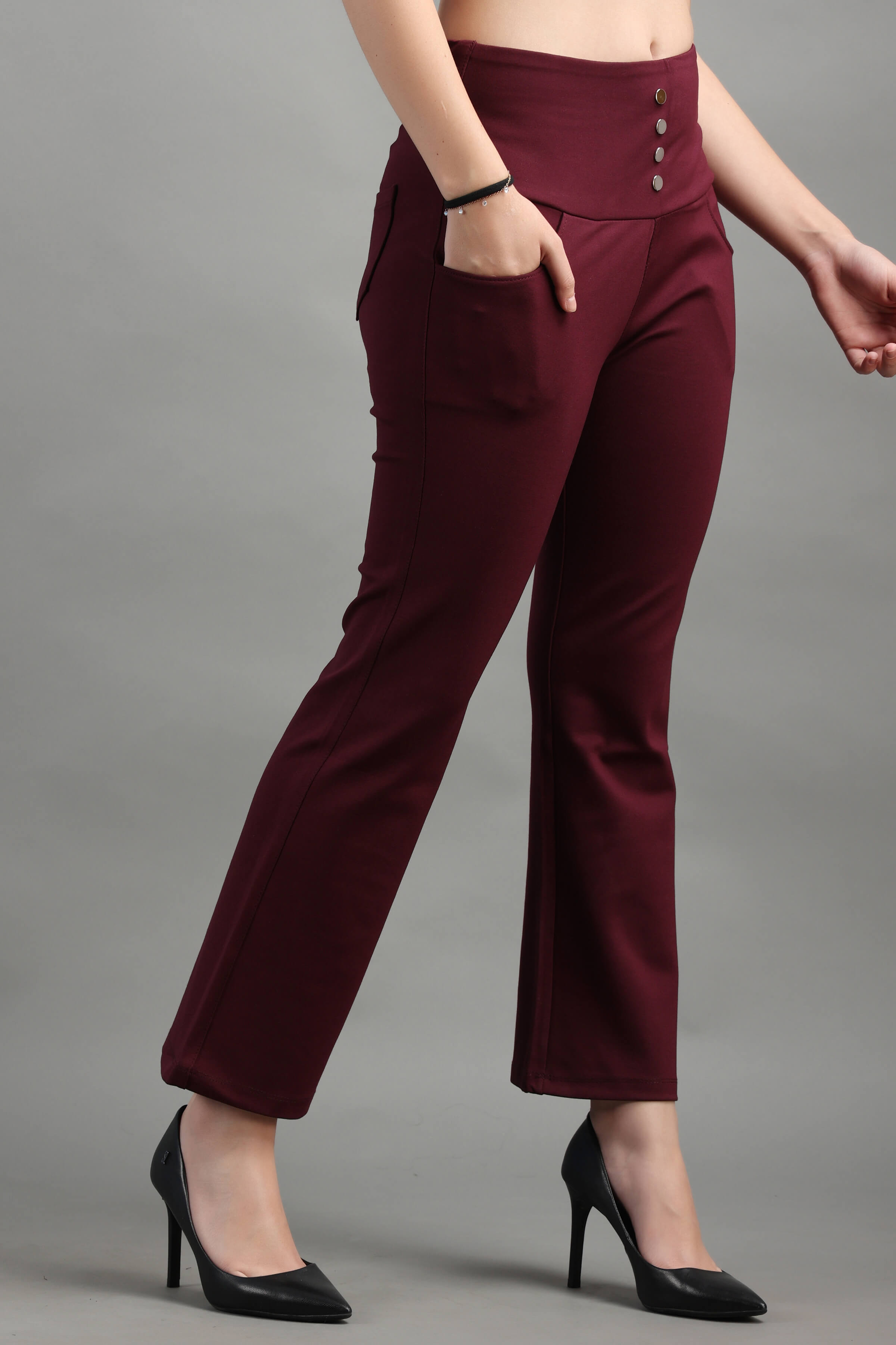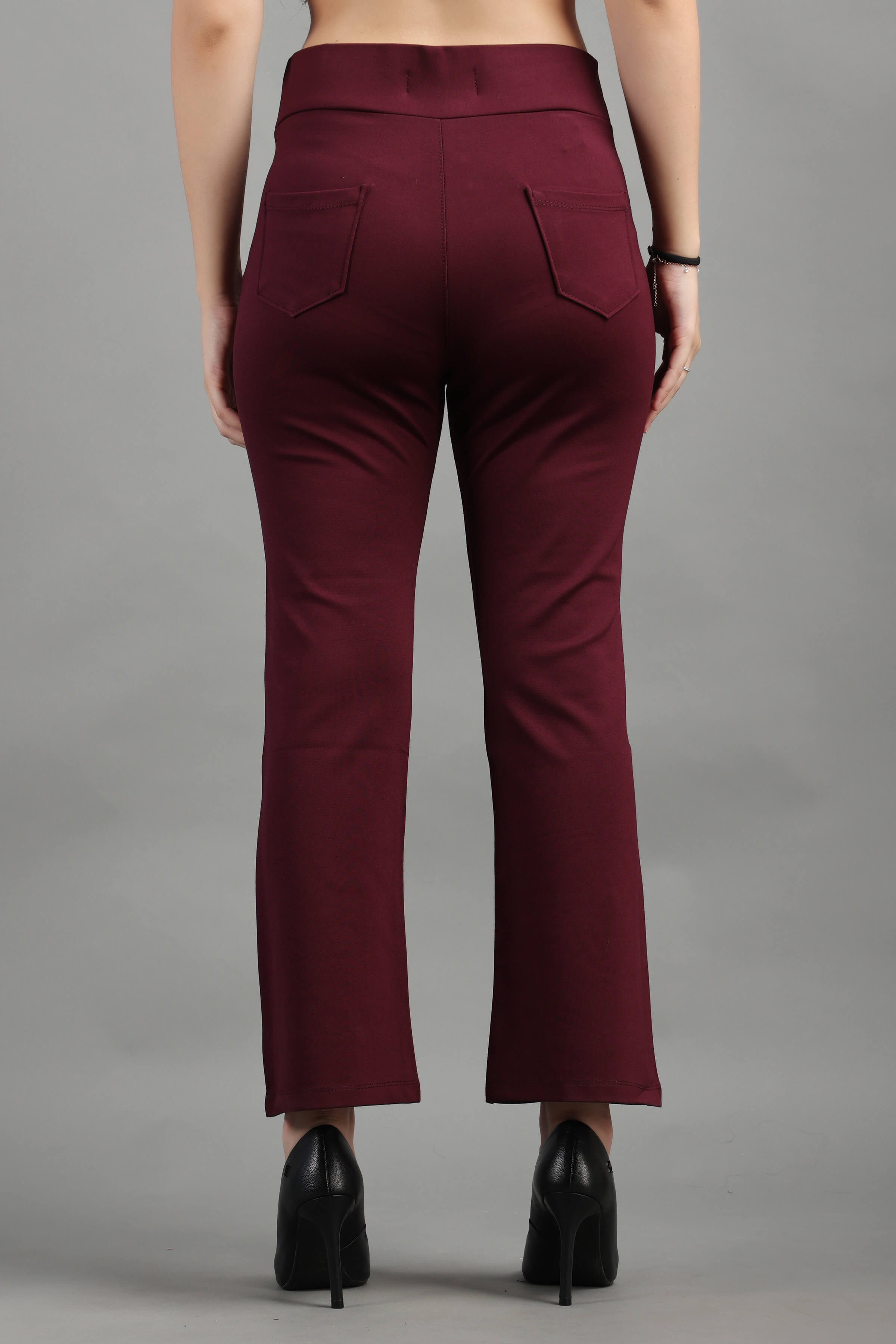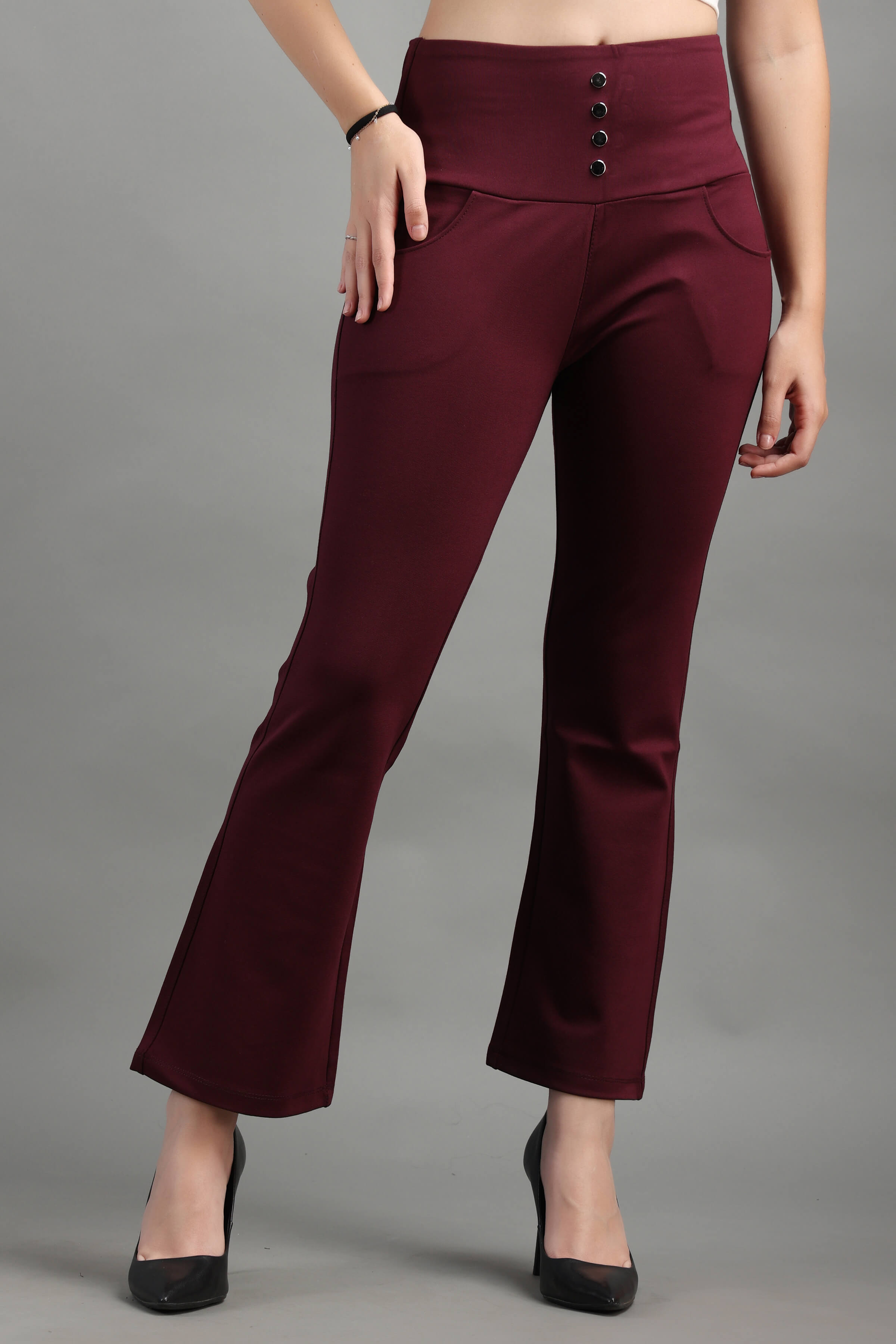 Wine Stylish and well fitted bootcut Jegging, Breathable and Premium smooth fabric for all-day comfort, has a broad elasticated waistband for extra comfort and two front pockets, All styling accessories (elastic, zipper, and buttons) used on the garment are of the best quality.