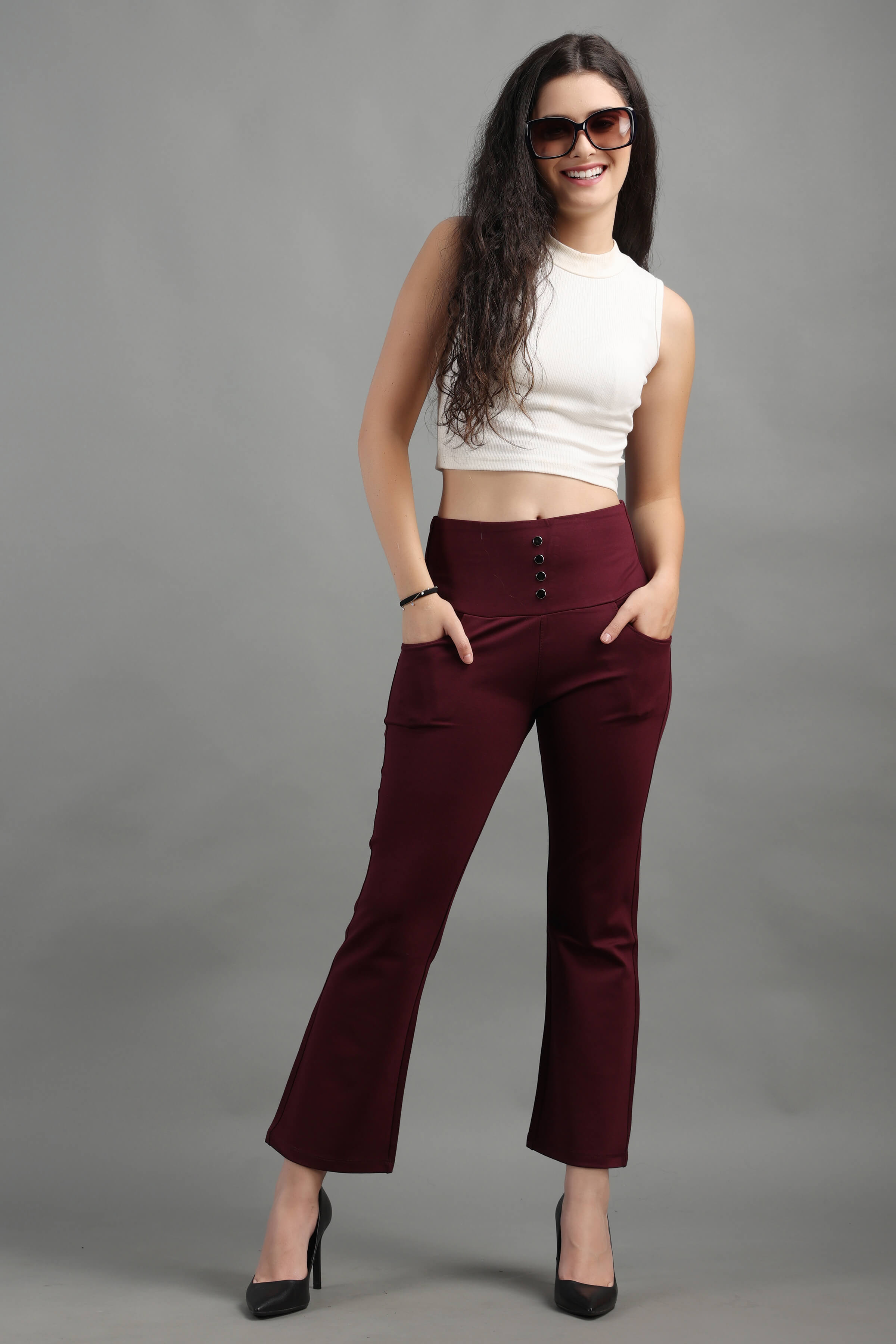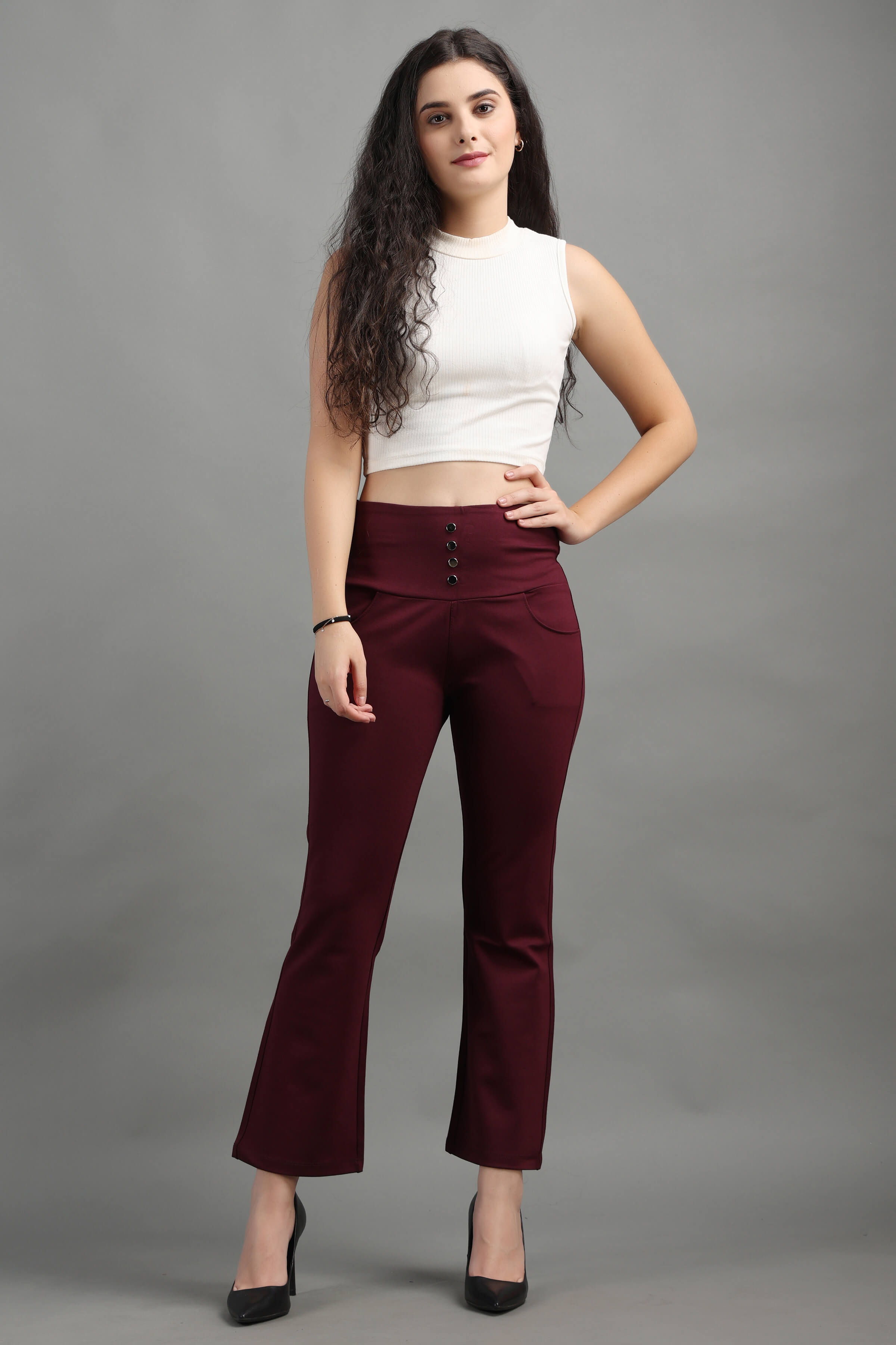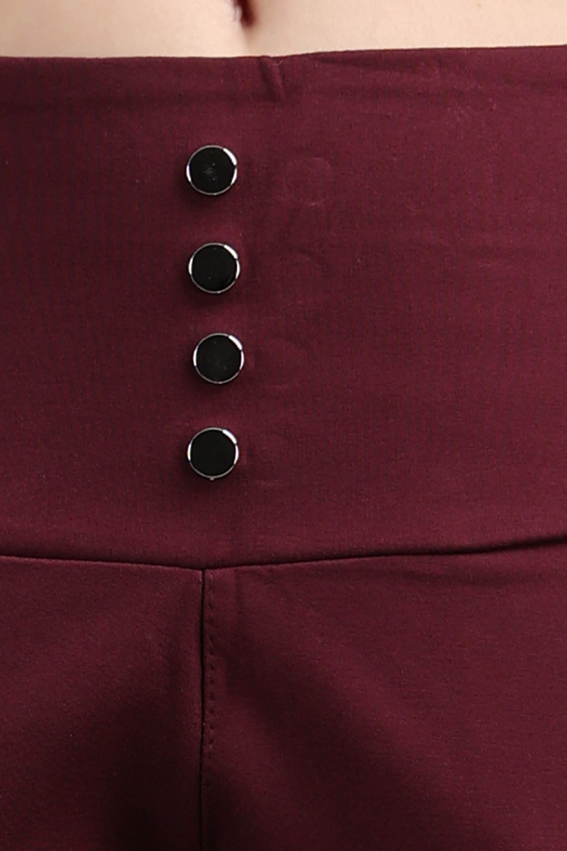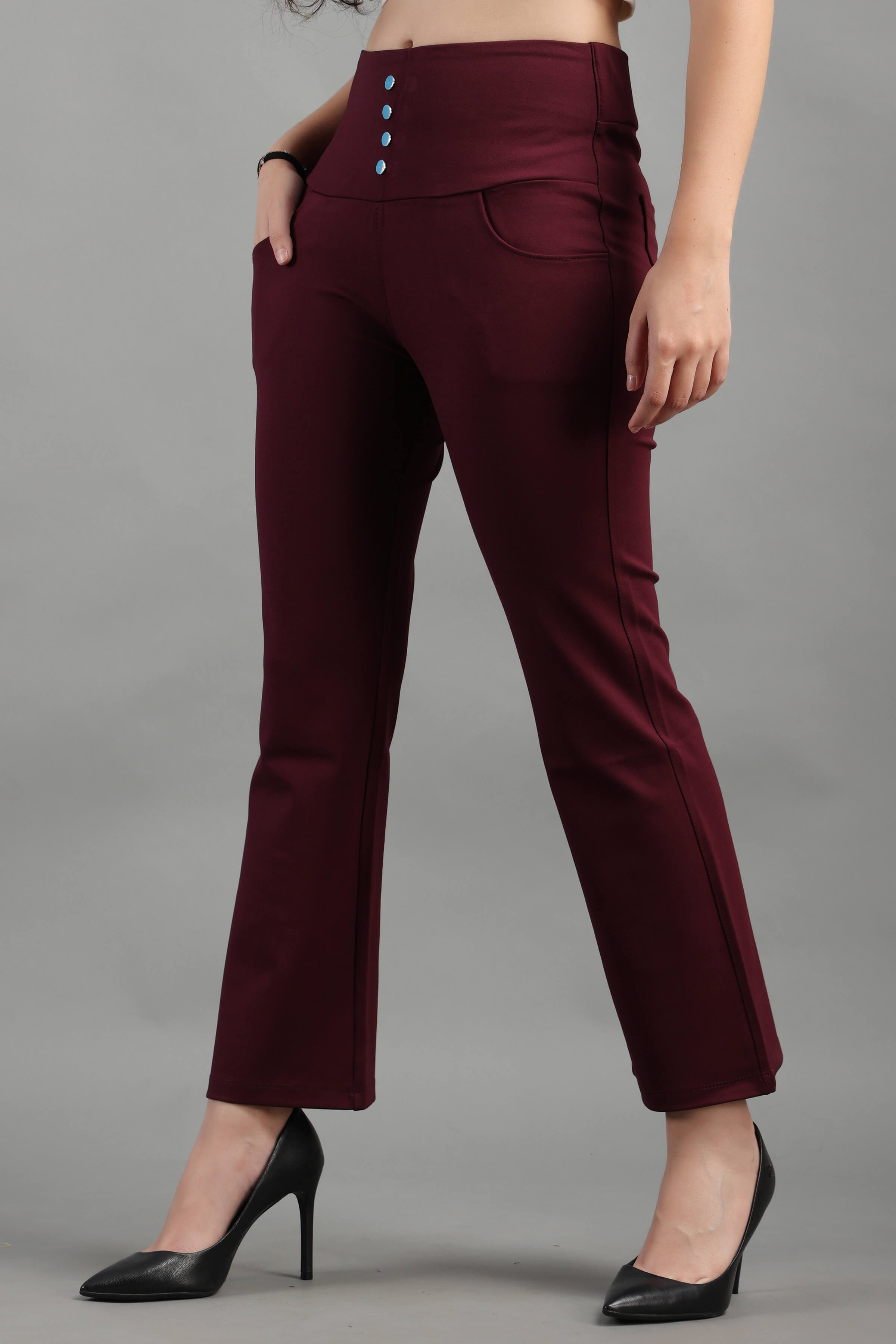 Wine Stylish and well fitted bootcut Jegging, Breathable and Premium smooth fabric for all-day comfort, has a broad elasticated waistband for extra comfort and two front pockets, All styling accessories (elastic, zipper, and buttons) used on the garment are of the best quality.